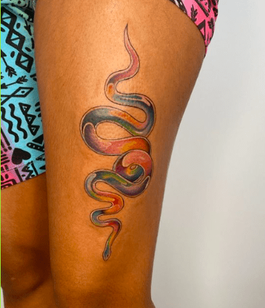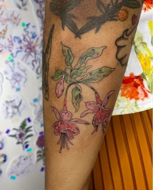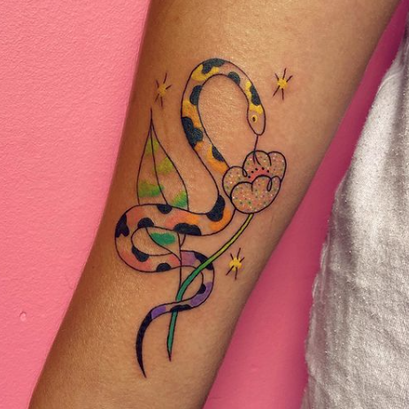 i offer complimentary colour consultations and colour test tattoos for people with melanated skin, free with any colour tattoo. colour tattoos can feel inaccessible for clients with dark skin tones, and racist views within the culture of tattooing have influenced what people believe it is possible to tattoo. you might be quite pleasantly surprised by what we can achieve, and i’d love to work with you to pick the best colours and make a really beautiful tattoo for you!
